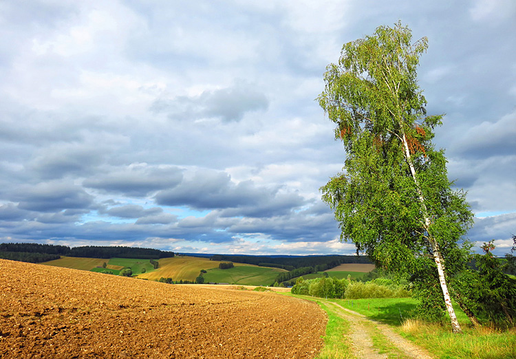 Auf dem Weg von Bad Elster nach Mühlhausen, einem kleinen Ort an der B92 gelegen, bieten sich typische Ausblicke wie dieser ins Obere Vogtland mit seinen sanften Hügeln, Wäldern und Wiesen.
