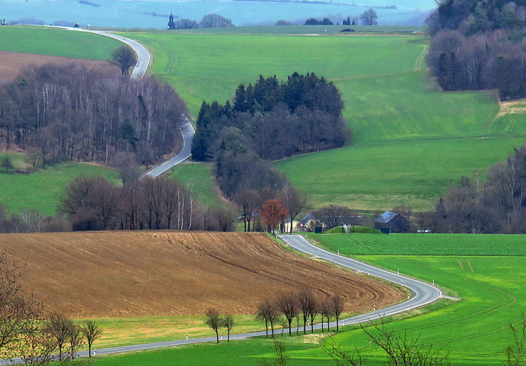 In vielen Windungen verläuft die Straße (K512, K203) zwischen Pansdorf und Greiz durch die Landschaft. Im Tal sind einige Häuser von Tremnitz zu sehen, oben im Bild ragt die Kirchturmspitze des Caselwitzer Gotteshauses über die Felder.
