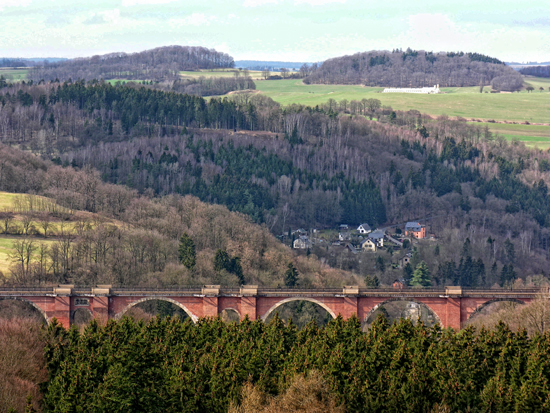 Die Elstertalbrücke vom Julius-Mosen-Turm aus gesehen. Im Hintergrund ein Teil der Ortschaft Barthmühle.