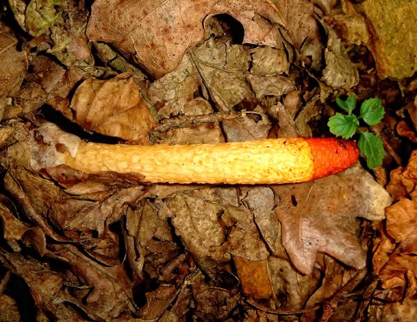 | Die Hundsrute (Mutinus caninus) kommt sehr selten vor, und es bedarf schon einiger Sorgfalt, um diesen ca. 9cm langen und nur etwa 8mm dicken Pilz nicht zu übersehen. Ähnlich wie die verwandte Stinkmorchel lockt sie mit ihrem aber eher schwach unangenehmen Geruch Insekten, vor allem Aasfliegen an, die die reife Sporenmasse, die sogenannte Gleba, fressen. Mit dem Fliegenkot werden die unverdaulichen Sporen abgesetzt, und es kommt auf diese Art und Weise zu einer Verbreitung . Die Hundsrute ist ein Pilz des Laubwaldes, in dem sie auf vermodernden Blättern und auf humusreichen Böden wächst. | ![]() |